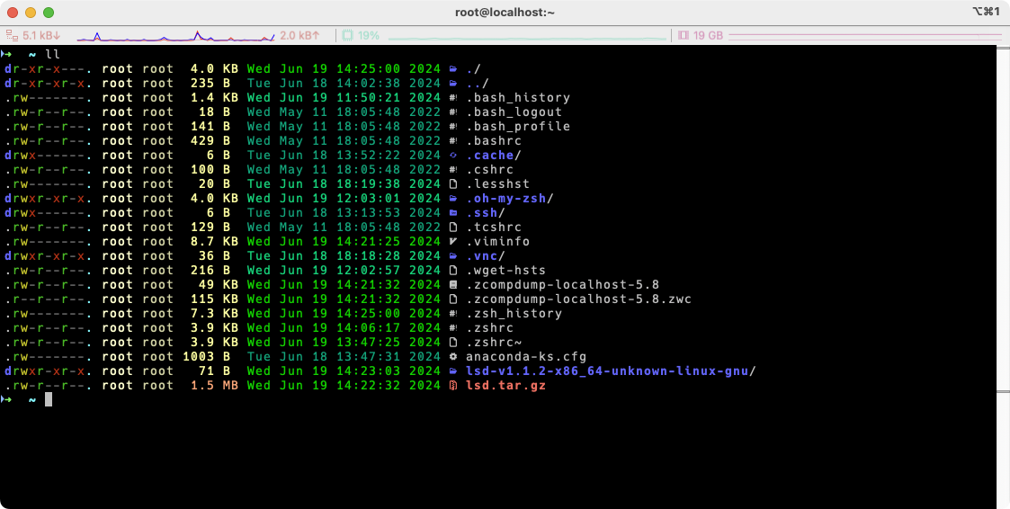 손에 익은 ls 명령어를 대체하기 위해서 alias 설정을 해준다. 현재 쉘이 zsh 이기 때문에 .zshrc 파일에 alias 를 추가했다.